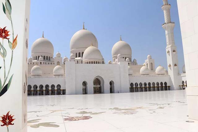 謝赫扎耶德清真寺是為已故老國王扎伊德所建,是阿聯酋的標志性建筑﹐整個建筑群都用來自南斯拉夫的白玉大理石,莊嚴肅穆,充分體現了伊斯蘭的風格。